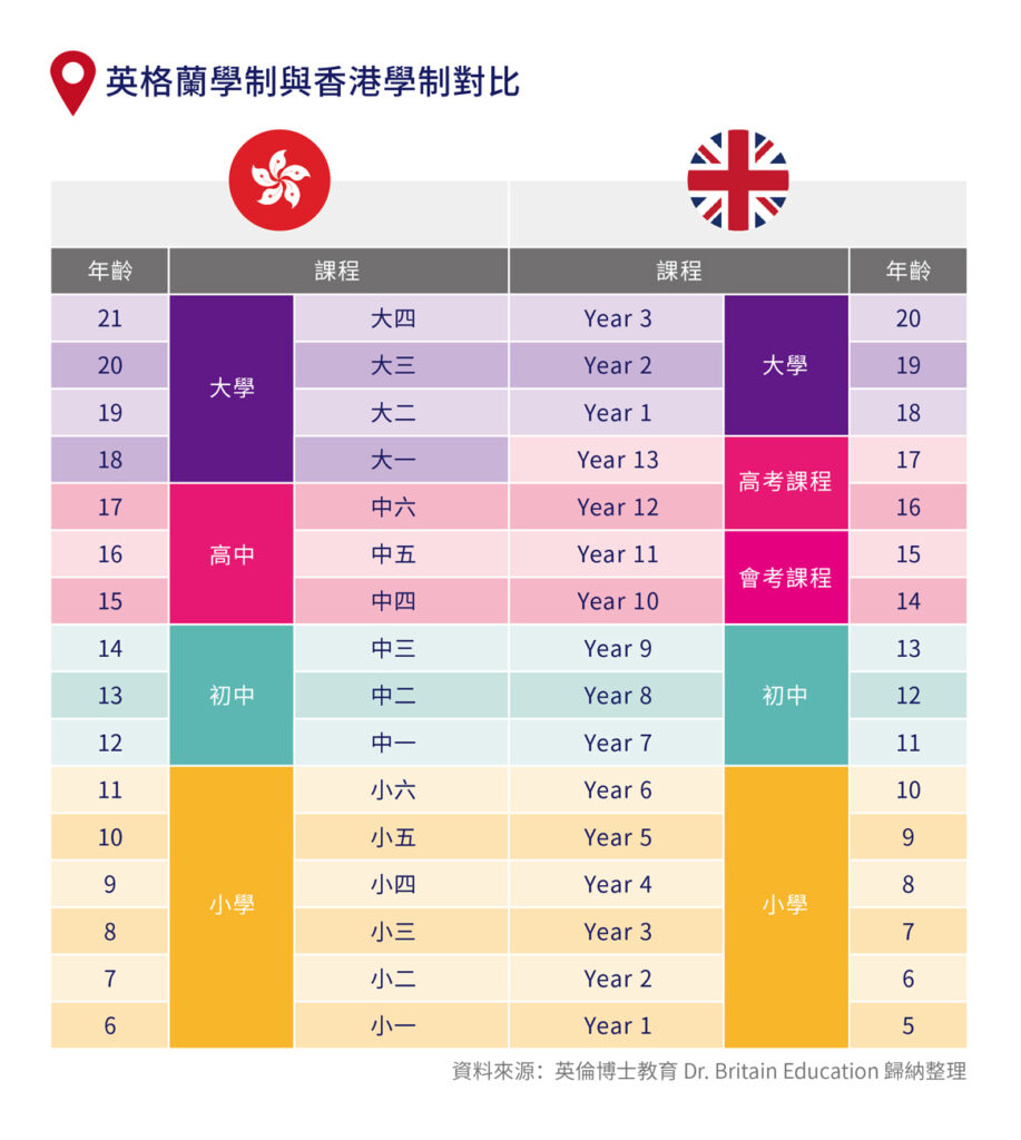 大家需留意英港學制的異同,英國學生5歲開始入讀小學一年級(比香港學生早一年),中學為七年制(比香港學生多讀一年),所以入讀大學年齡同為18歲。若就讀英國大學(三年制),學生將於21歲畢業,比起在香港完成本科學位(四年制)早一年畢業。英國與香港學制(三三四)的比較和對應關係,可以參照下表。