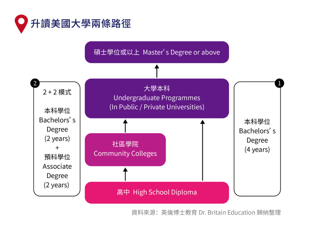 美國學制與香港一樣為「三三四」,初中三年、高中三年、大學四年。香港留學生升讀美國大學主要有兩條路徑: